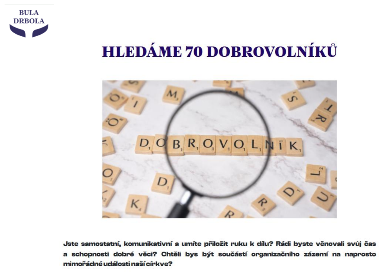 Sháníme rovněž ještě cca 70 dobrovolníků, kteří nám pomohou s organizací akce. Pokud byste chtěli tento jedinečný den prožít ve službě ostatním, budeme rádi, když se přihlásíte přes formulář na webu. Máme jedinou podmínku - musí vám být 18 a více let.